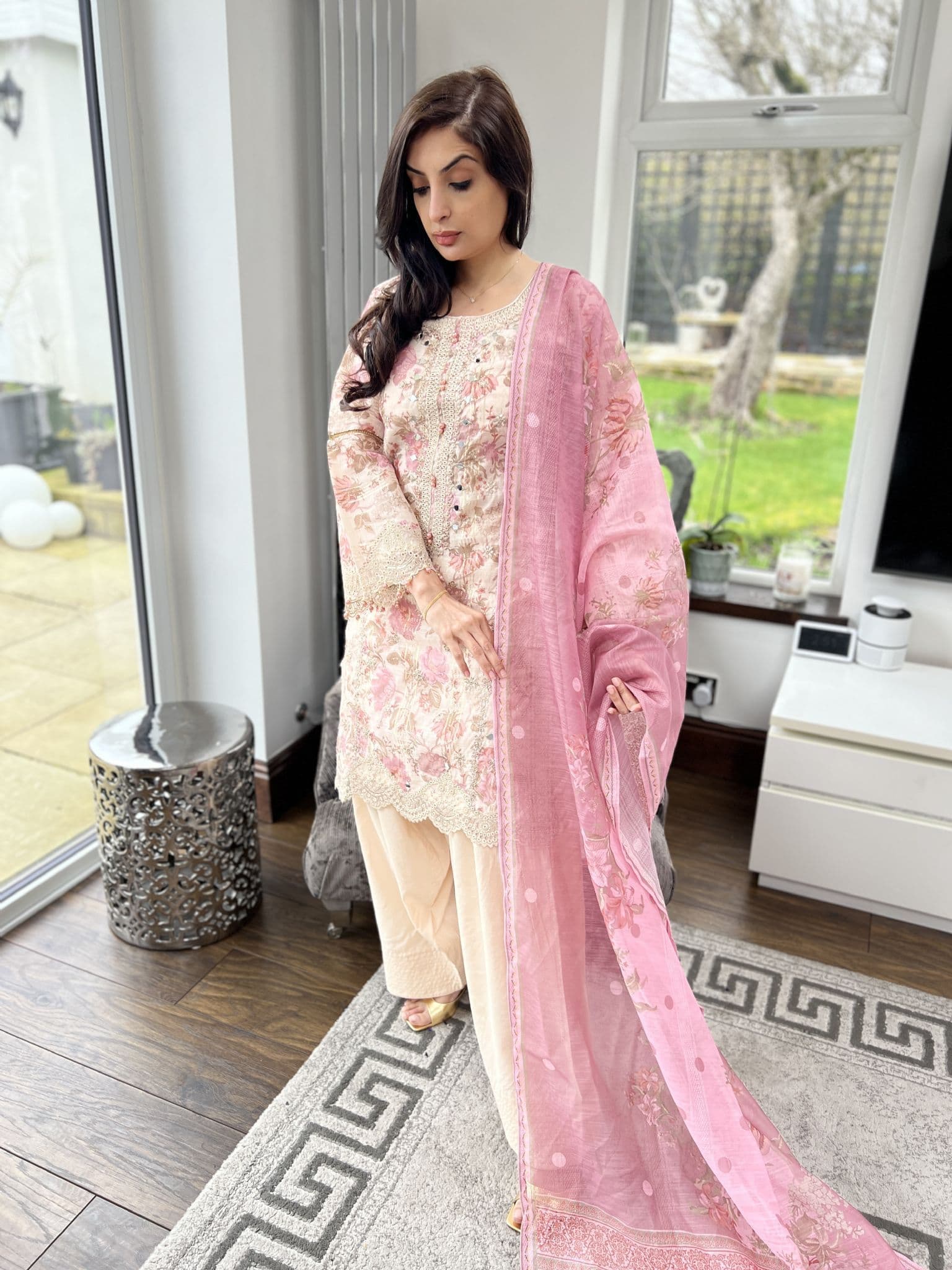 • The kameez has a soft cream base with pastel floral prints in shades of blush pink, peach, and muted green.