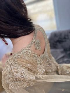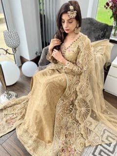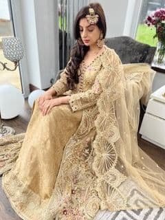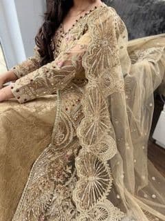 This heavily embroidered dress with thread work and stone work with an under dress of banarsi, has pencil trousers and a stunning duppatta